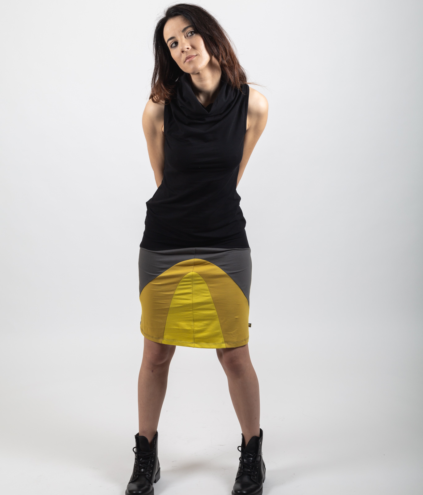 65,00 € 22,00 €Vestit negre...si!!!, però amb un toc de color. Aquest vestit està ple de contrasts, el cos negre vs faldilla a tope de color, escot elegant vs teixit còmode i informal, aconseguint que amb una sola peça de roba et vegis genial. Està confeccionat amb cotó elàstic.